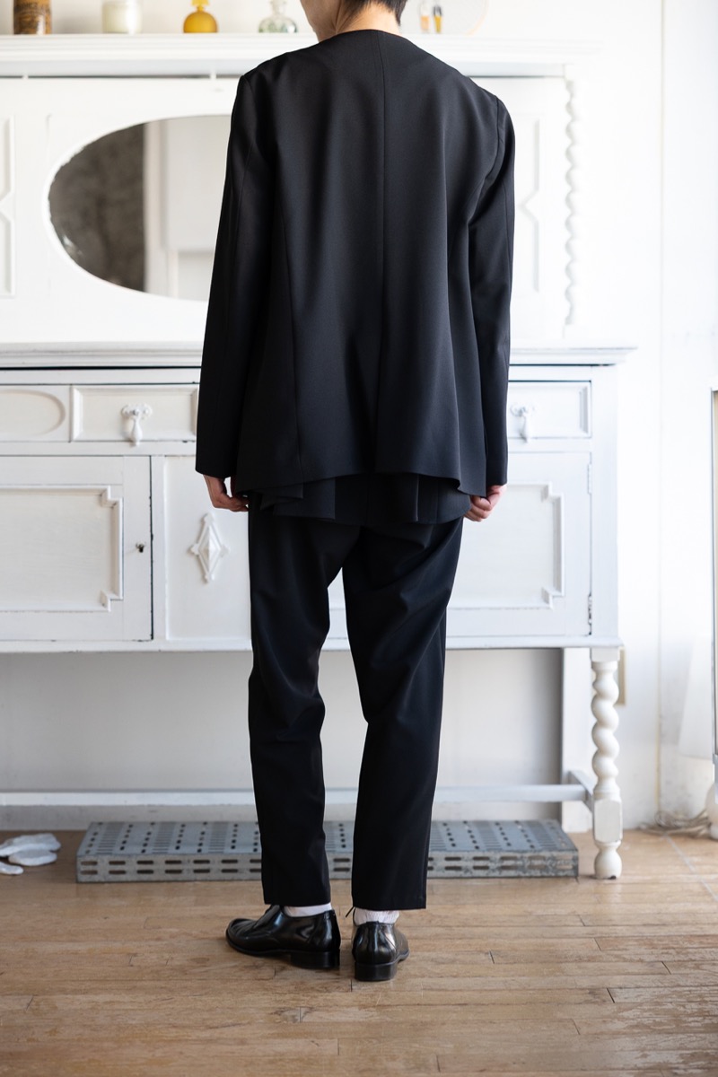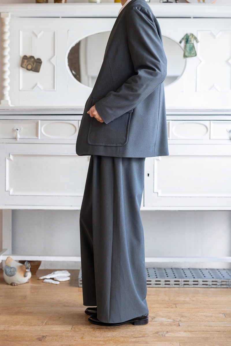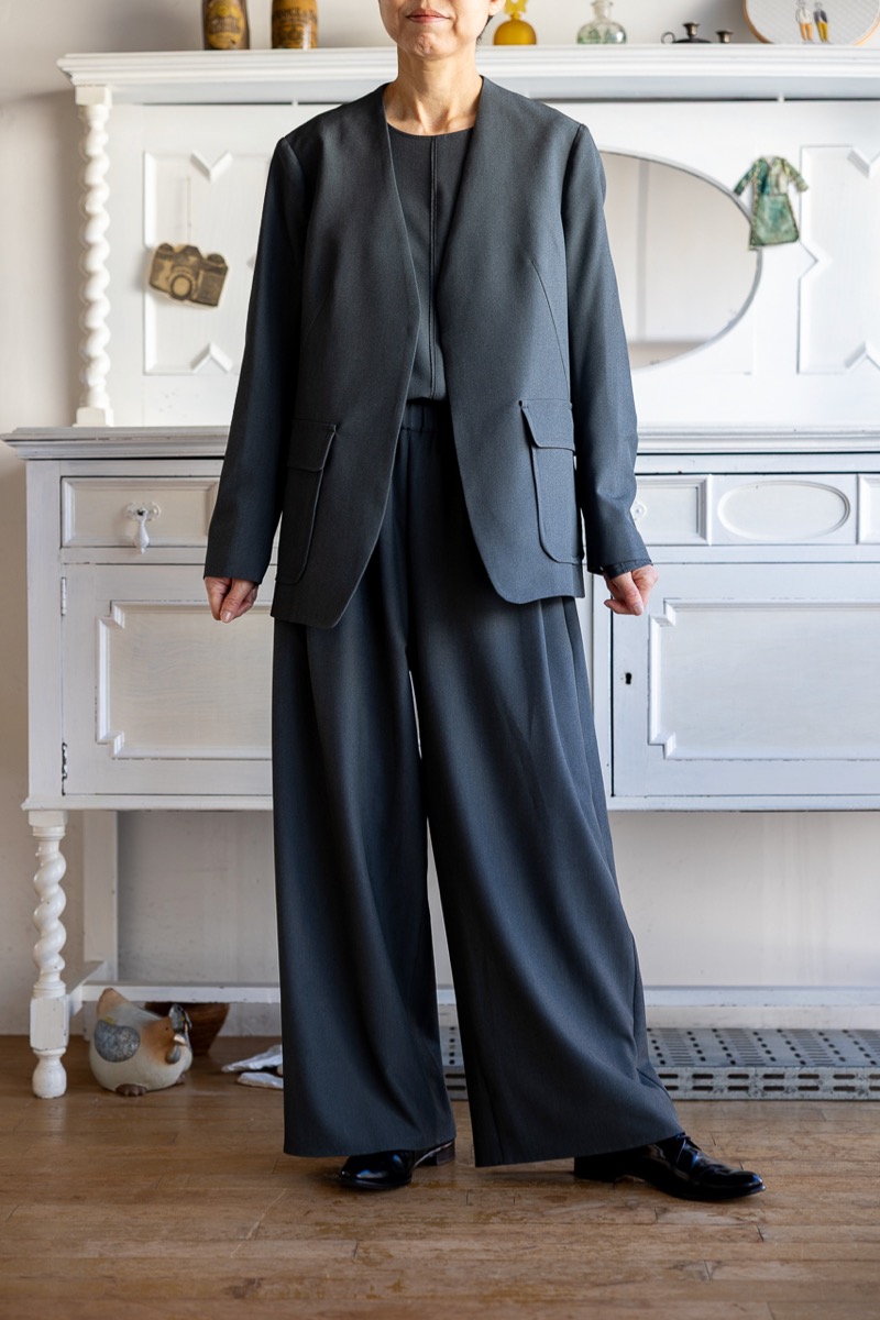 上のチャコールのセットアップにCのノーカラージャケットを羽織って。