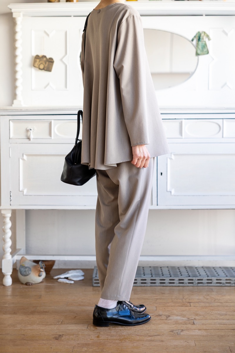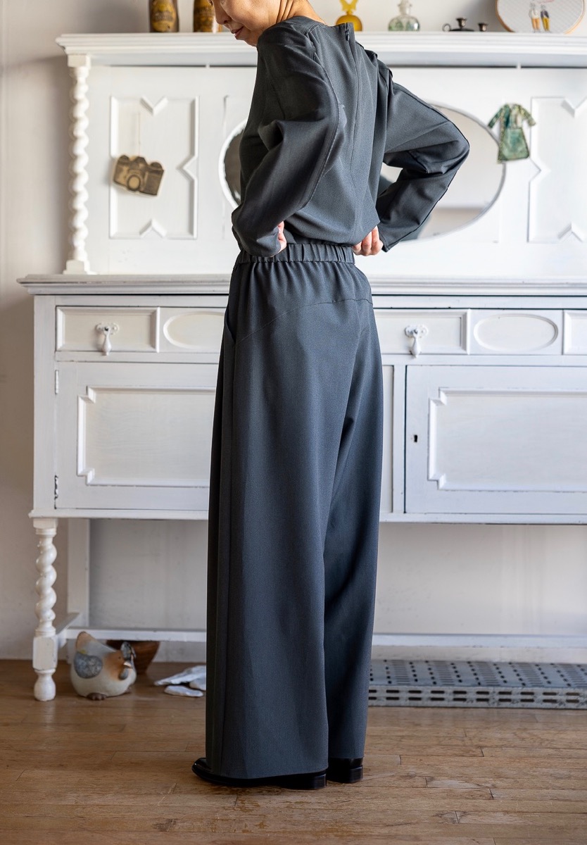 EのブラウスとFのワイドパンツのセットアップ。チャコールです。