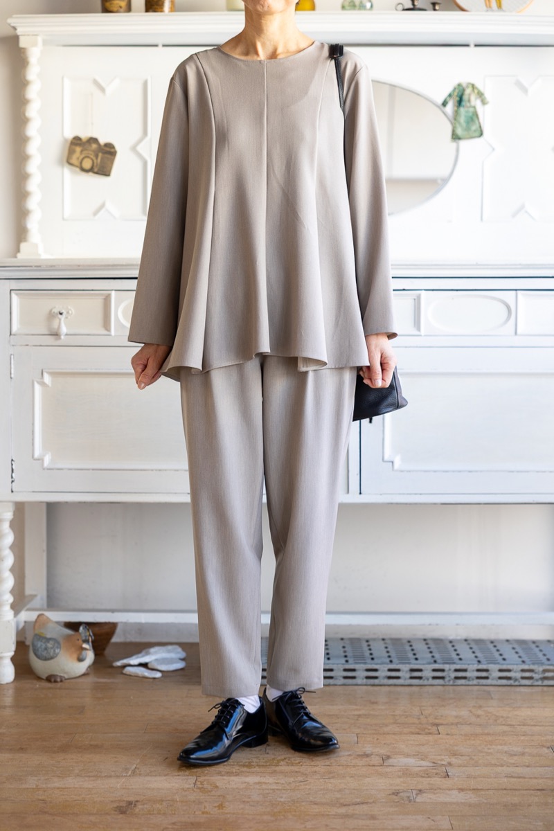 まずはドレープが綺麗なトップスと、ウエストゴム仕様のテーパードパンツ。