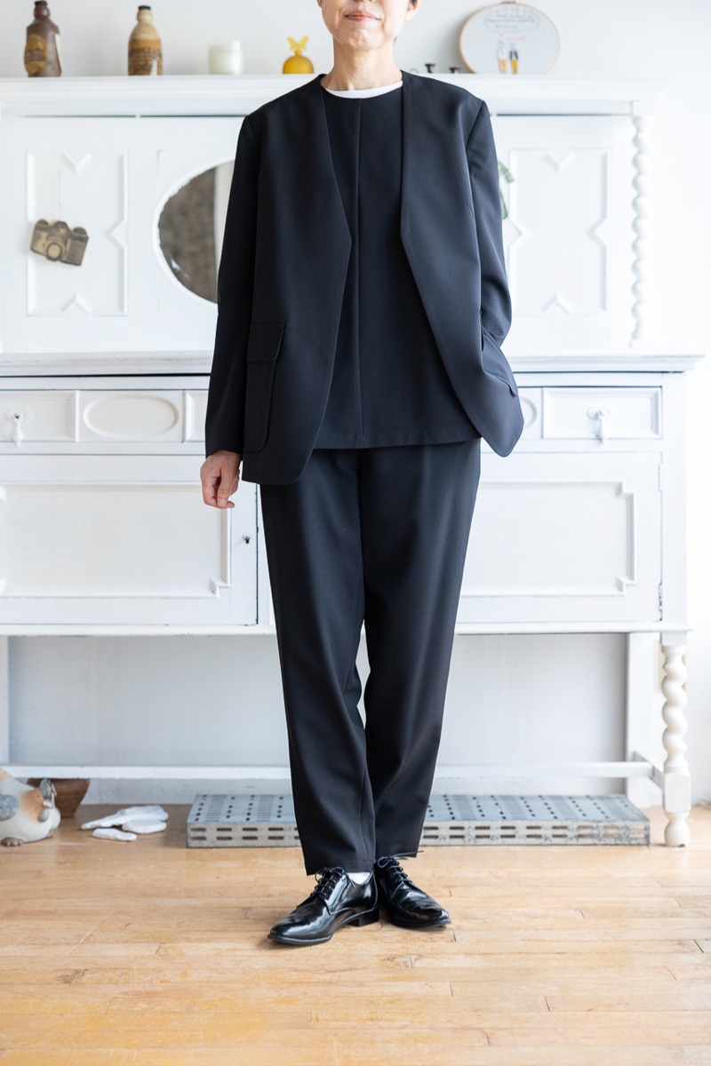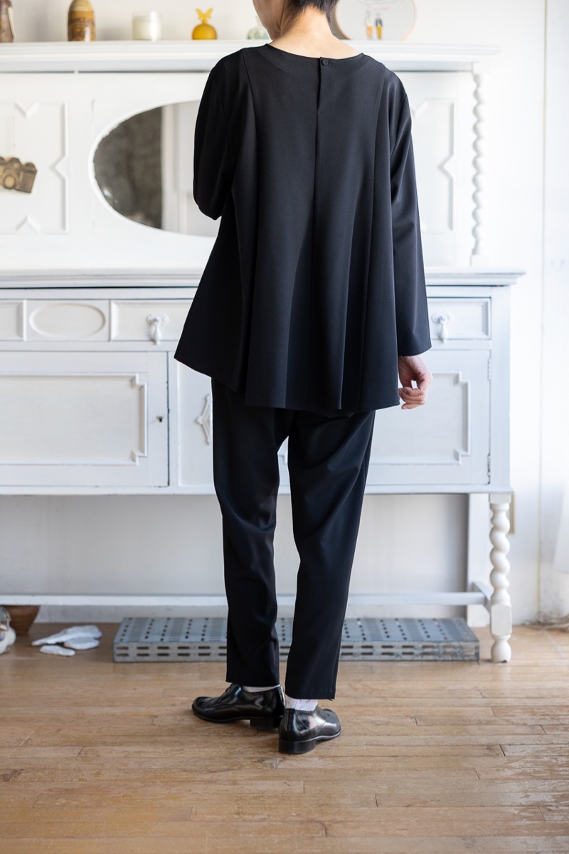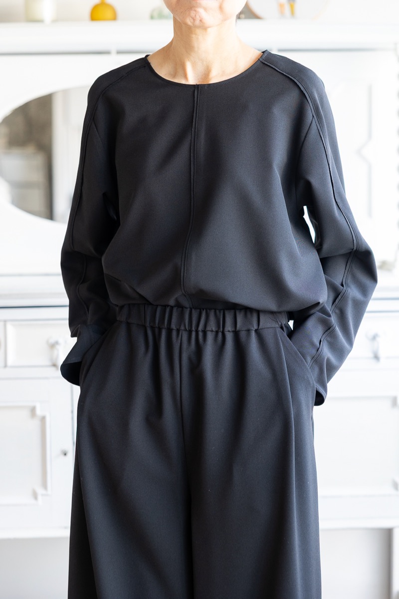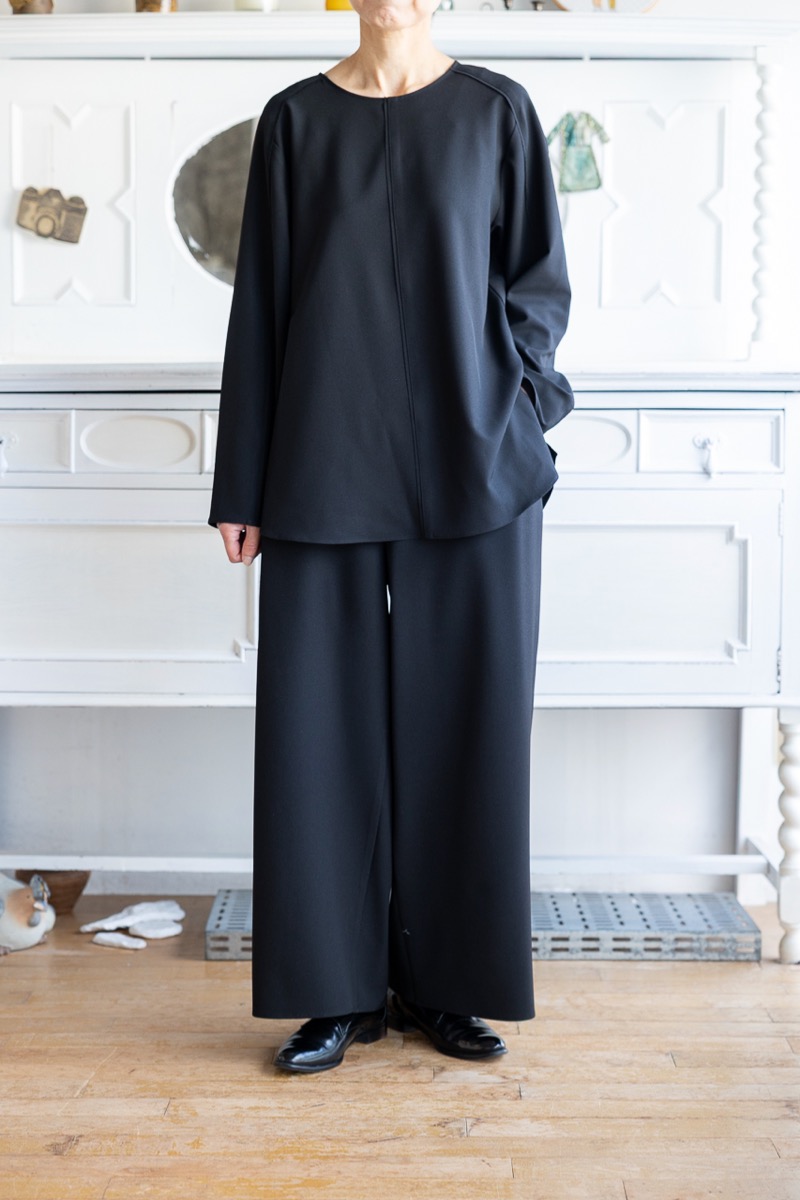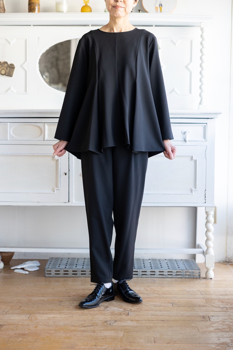 インナーをAのドレープブラウスに変えて、Fのワイドパンツと組み合わせました。ブラックのセットアップです。