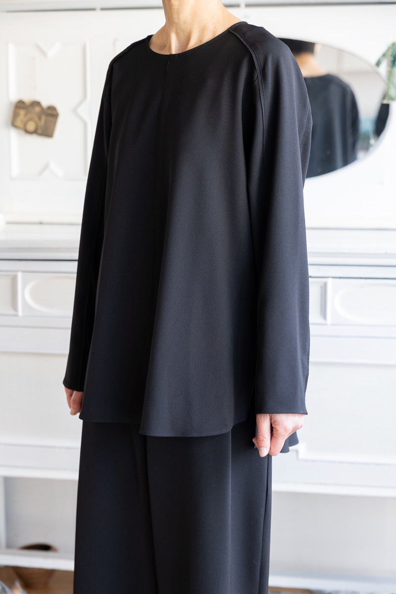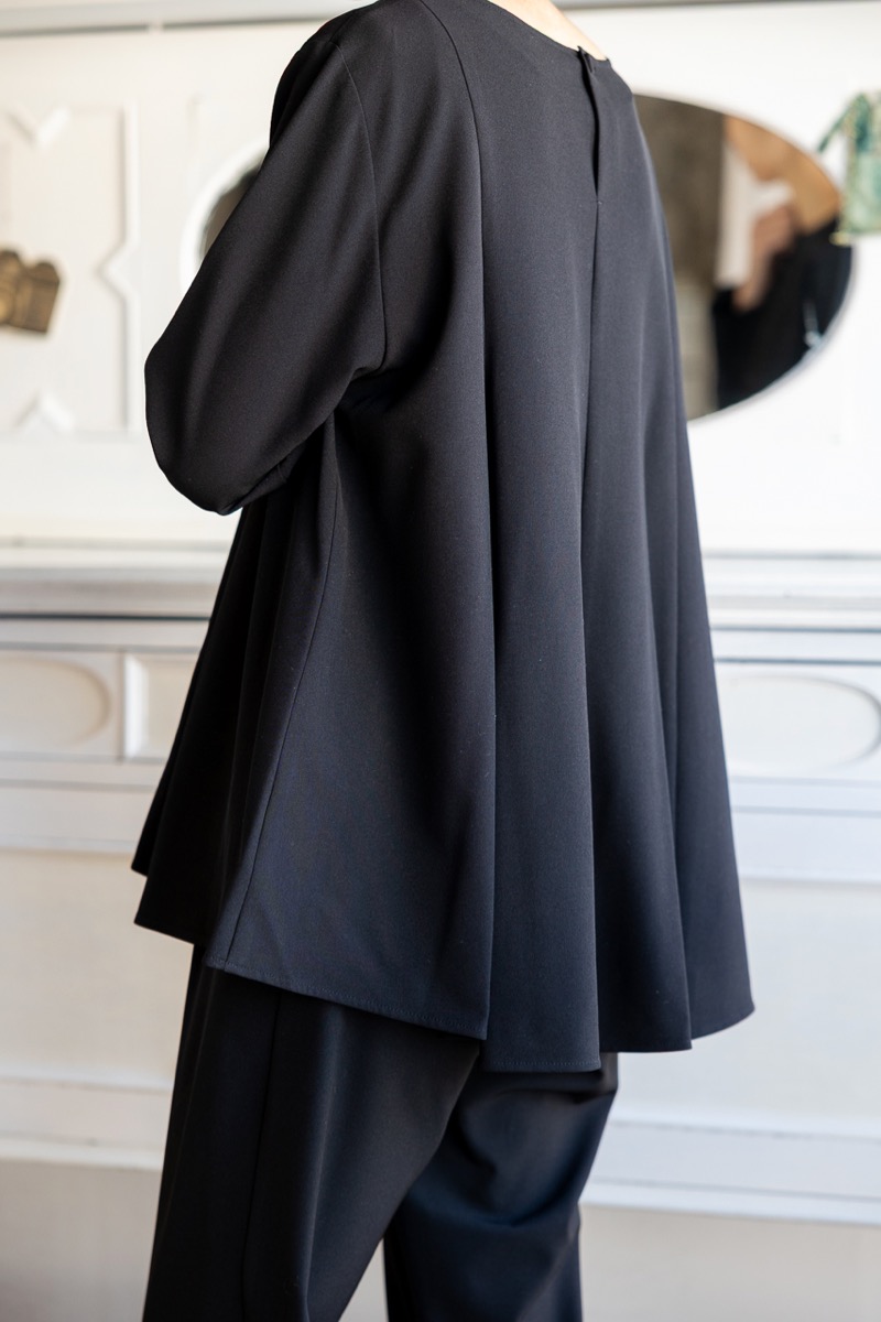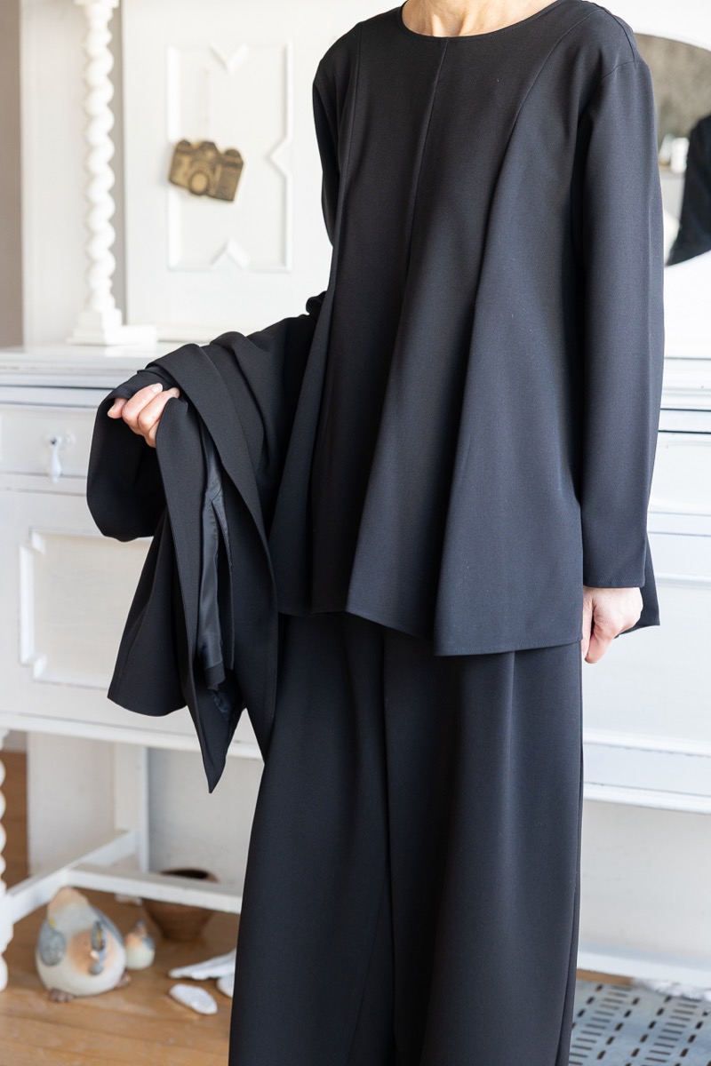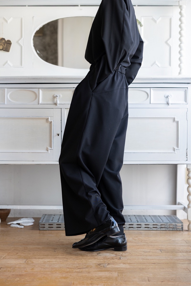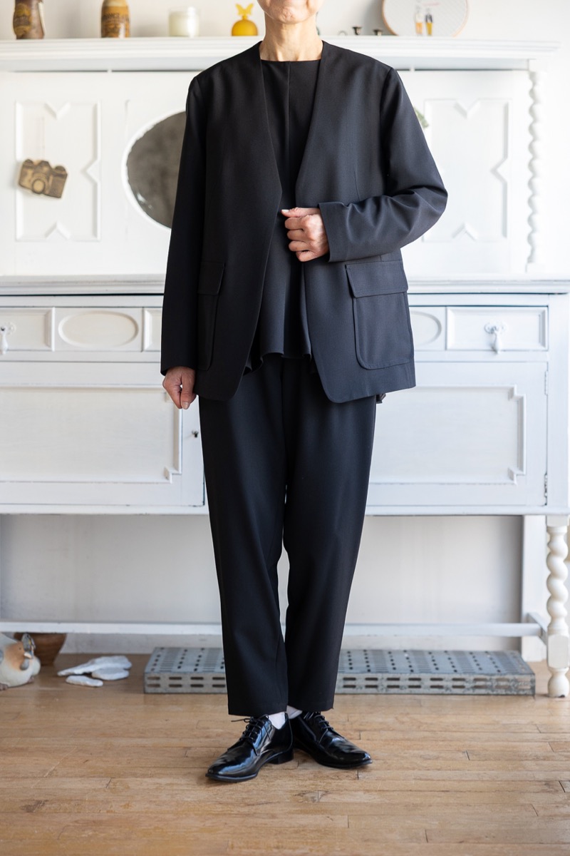 インナーをAのドレープブラウスに変えて、Fのワイドパンツと組み合わせました。ブラックのセットアップです。