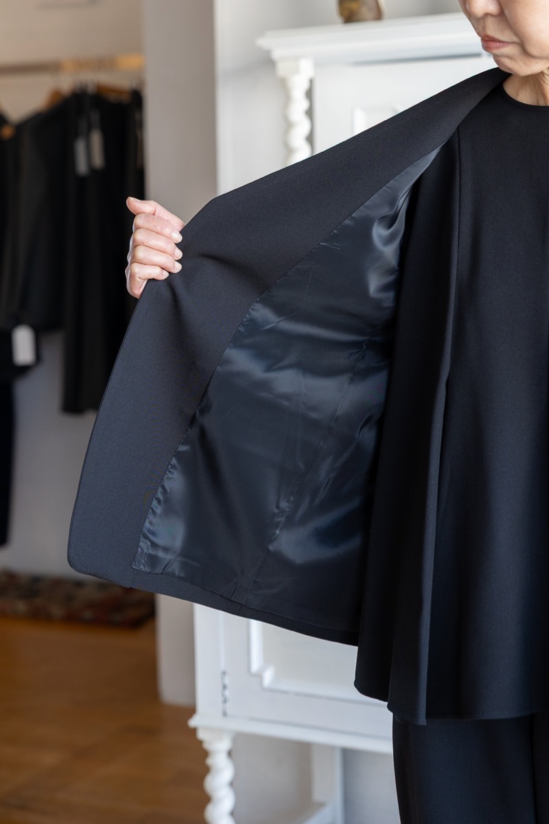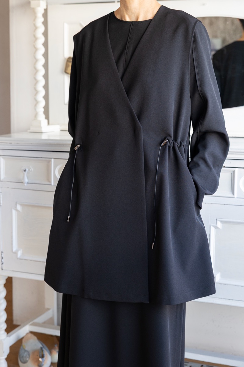 *身幅もゆるめ、ボタンのない羽織るだけのジャケットです。