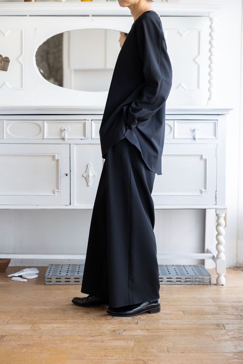 落ち感が綺麗なブラウスとワイドパンツです。ブラックのセットアップで着用しています。