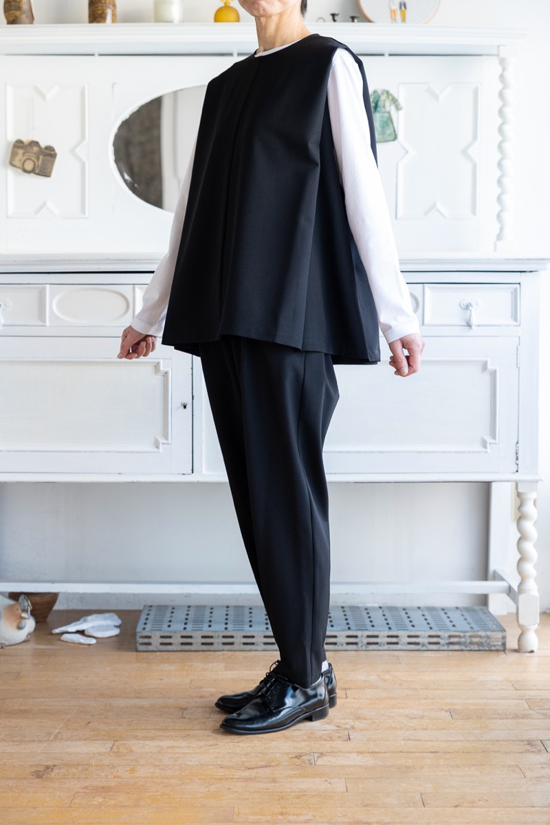 Bのテーパードパンツに、ノースリーブブラウスをベスト風に合わせました。ブラックのセットアップです。