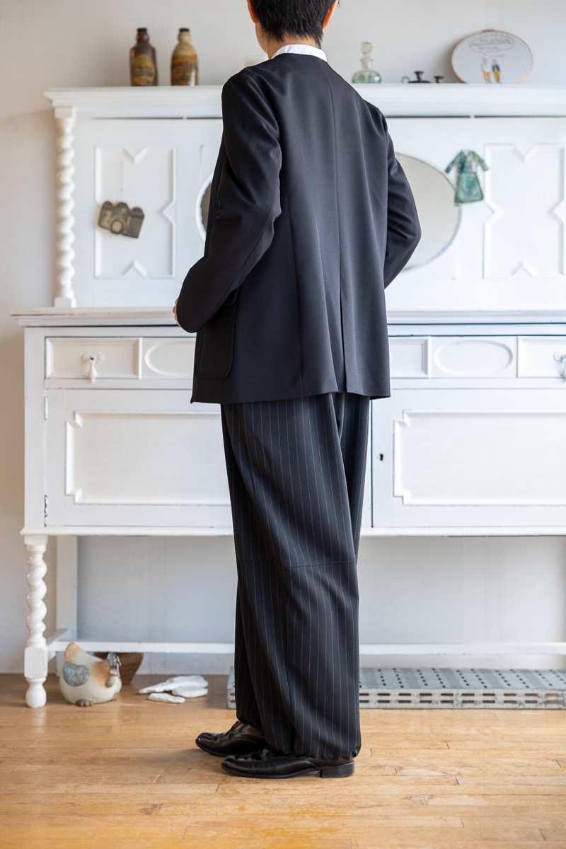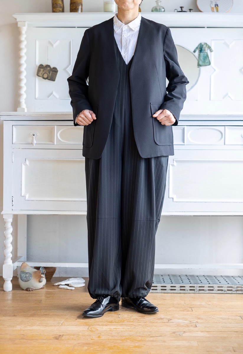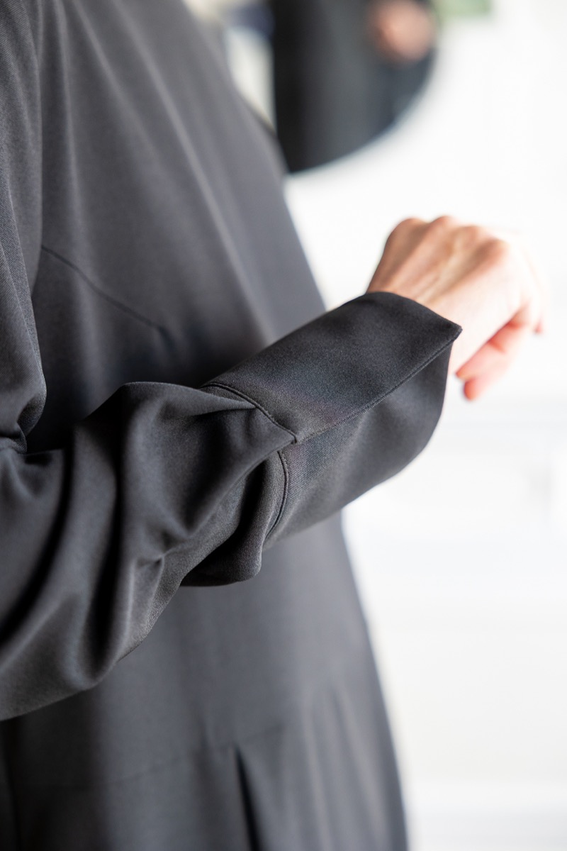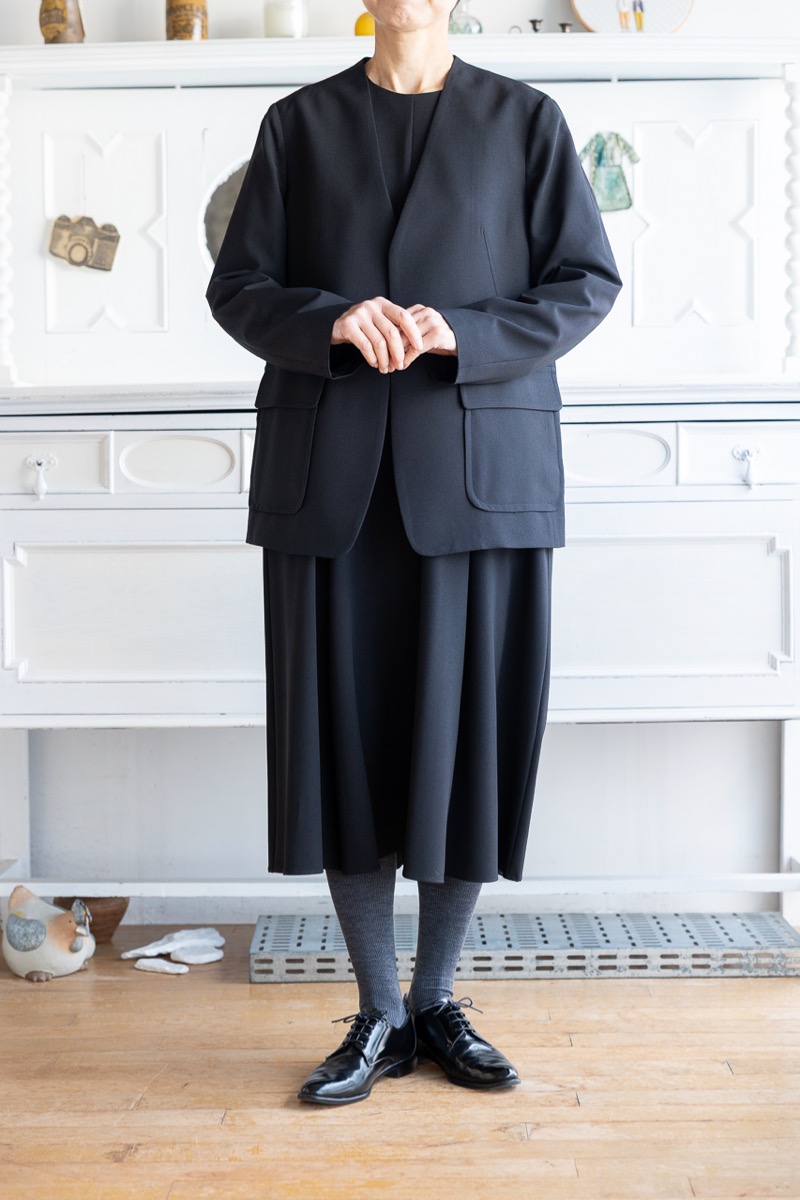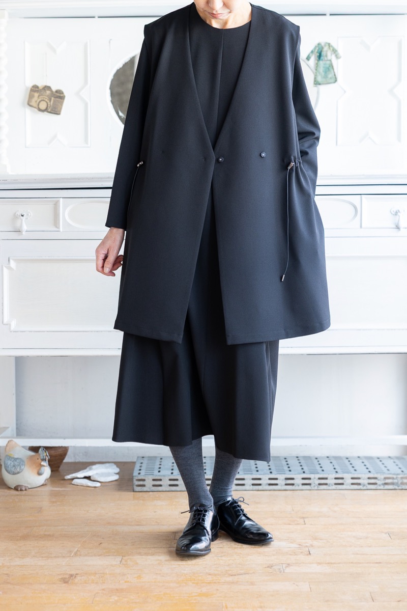 ウエストよりやや上めの切り替えでスッキリ。広めのカフスもアクセント。ブラック着用。