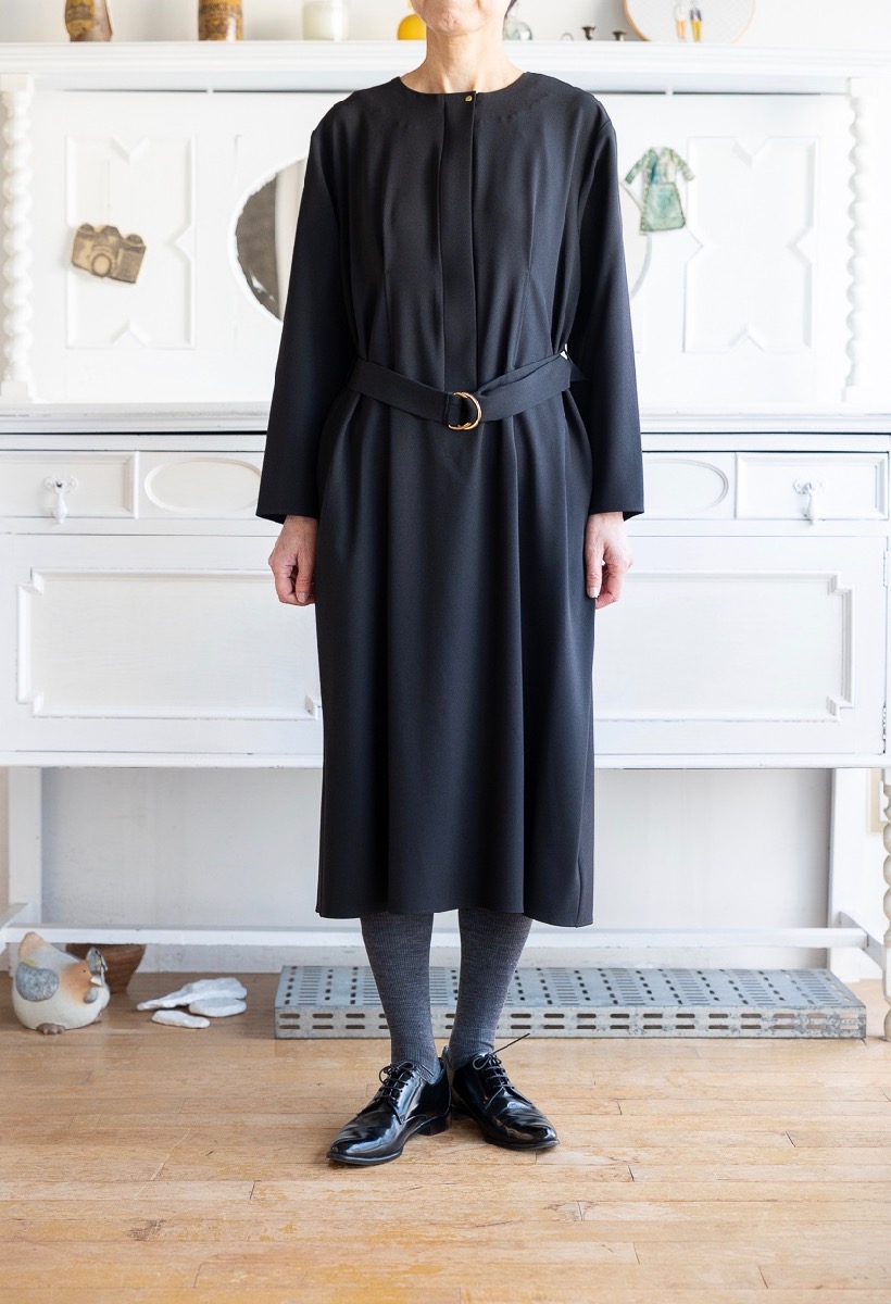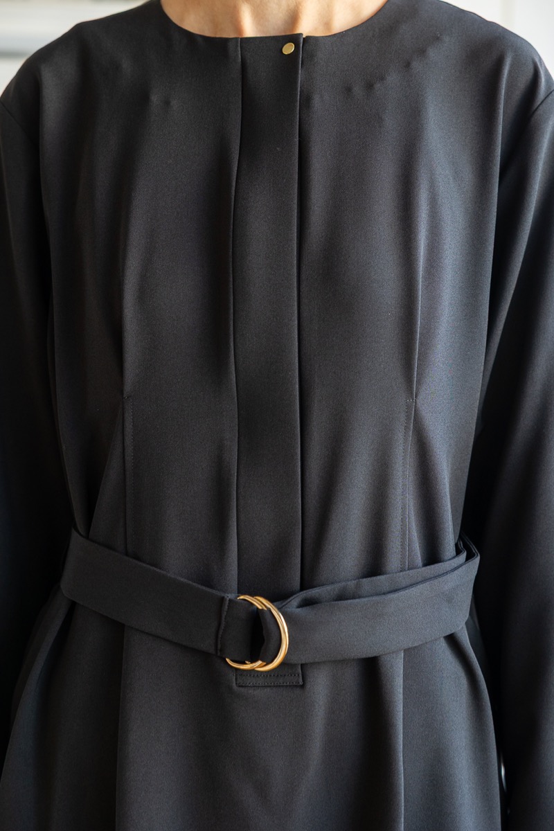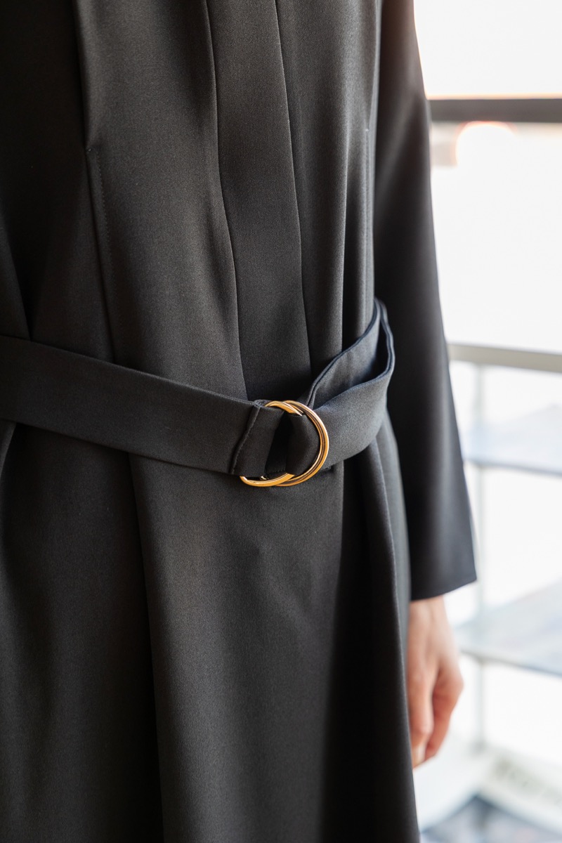 ゴールドの金具がアクセント。ベルト付きのワンピースです。ブラック着用。