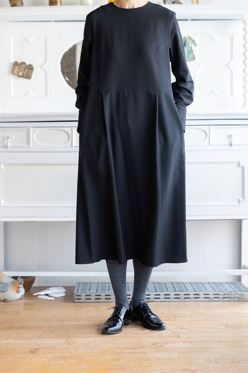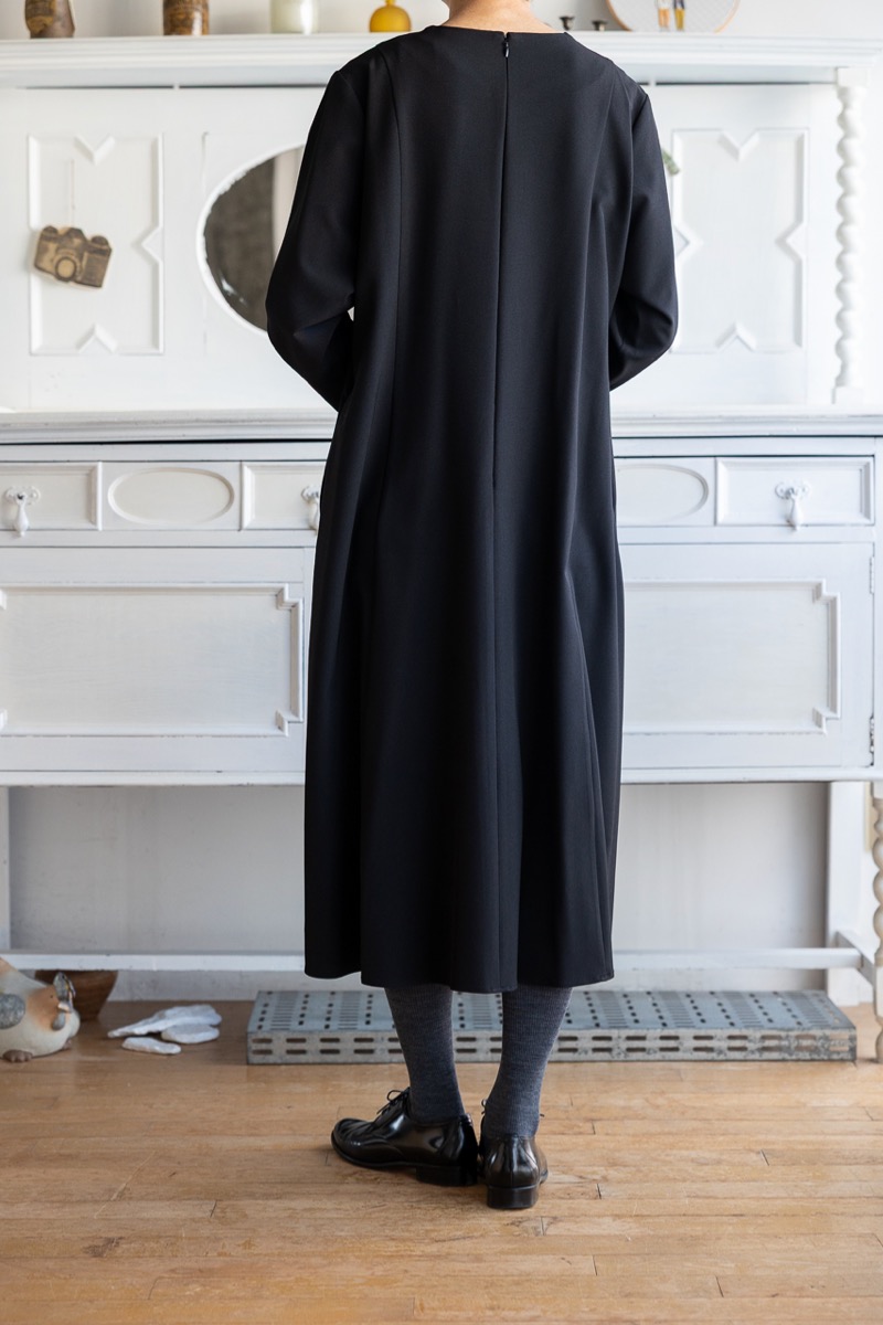 長すぎない丈がスッキリ。シンプルなワンピースです。ブラック着用。