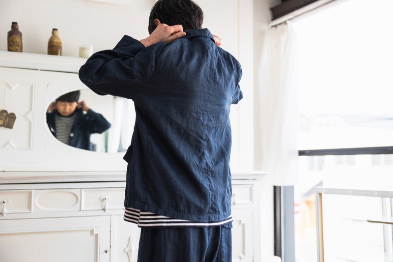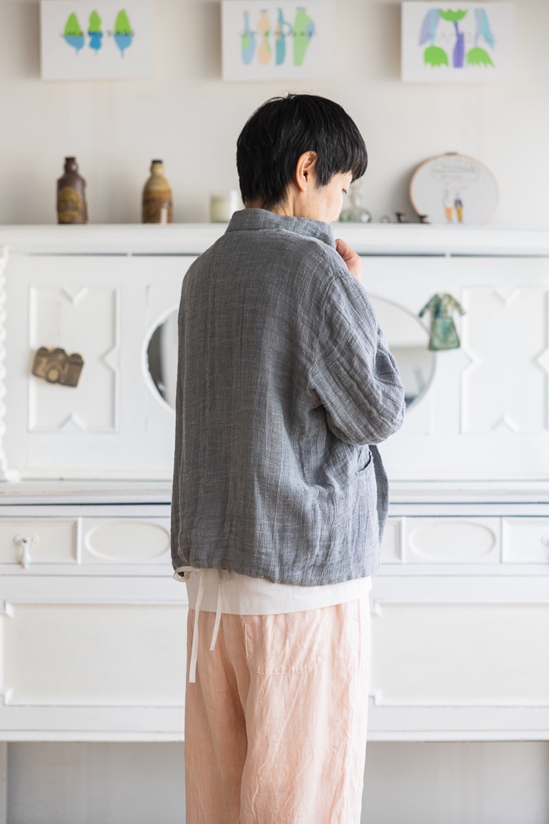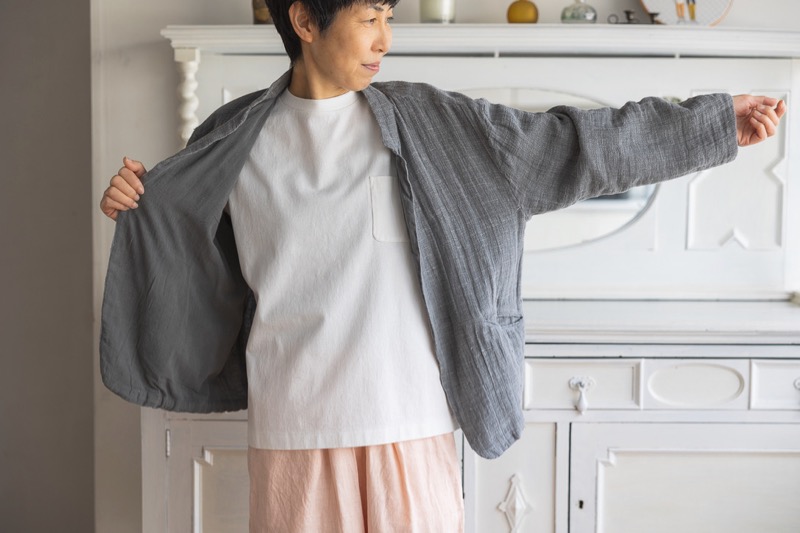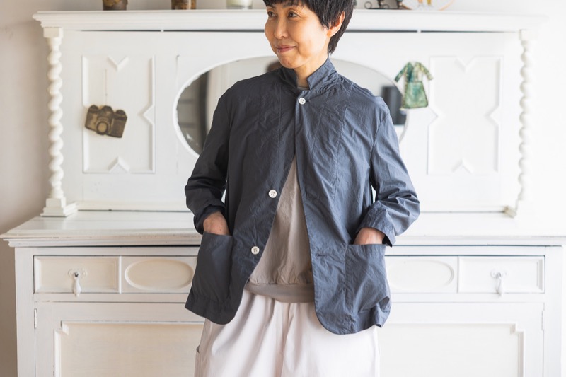 身長160センチのスタッフが、Tシャツの上からラフに羽織れる軽やかなジャケットをご紹介します。